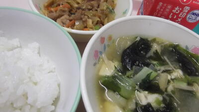 今日は、魚と大豆のごまケチャップあえ、玉ねぎとベーコンのスープなどが出ました。