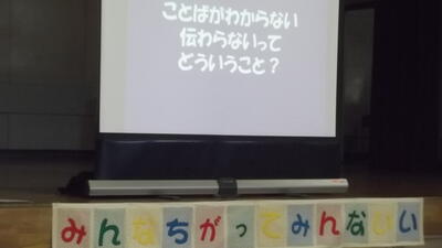 学年の先生一人だけが、みんなが使っている言葉がわからない状況を作り、子どもたちには体験する様子を見てもらいます。その後、先生にどのような気持ちだったか感想を伝えてもらいました。