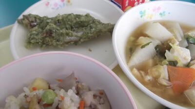 今日は、吹き寄せご飯やかぶのみそしる、ししゃもの磯部揚げなどが出ました。