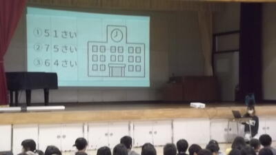 学校は今何歳?子どもの数は?校長先生の名前は?学校ができた時の名前は?など、クイズのスライドを作ってくれていました。児童会の皆さん、ありがとう!