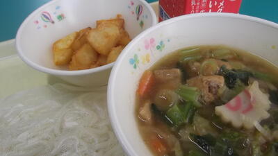 今日の給食は、きつねソフトめん・牛乳・カントリーポテトでした。