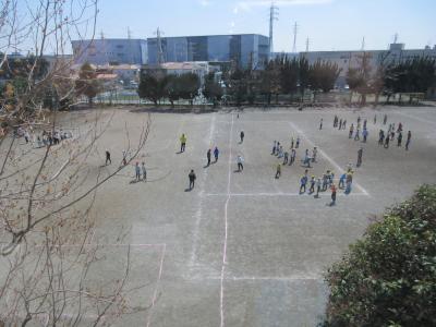 多くのクラスが出ても、なお広々使える相模野小の校庭です。
