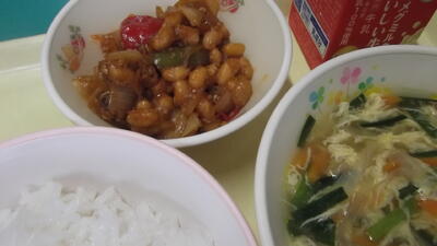 今日は、魚と大豆のごまケチャップあえ、玉ねぎとベーコンのスープなどが出ました。