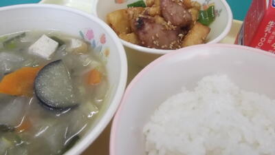 今日は、豚キムチ丼や茎わかめスープなどが出ました。